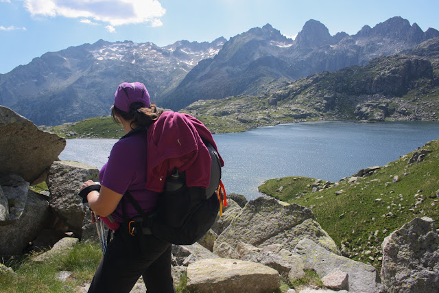 Algo mas frescos emprendimos el último tramo de la jornada, nada mas pasar el lago nos encontramos con unas vacas, vimos poco ganado en todos estos días, por lo que habíamos podido observa había pocos pastizales por la zona. Enseguida nos dimos cuenta que prácticamente todo lo que nos quedaba era bajada. Teníamos por delante un bonito valle que estaba flanqueado por la derecha por la Sierra de Tumenia. Descendimos hasta el Estany de Clot, este tramo estaba resultando bastante sencillo. Algo más adelante nos encontramos con el Estany Travessani que ya habíamos visto desde la distancia y a su izquierda pudimos apreciar las curiosas y verticales agujas que llevan el mismo nombre.